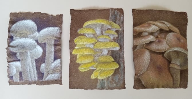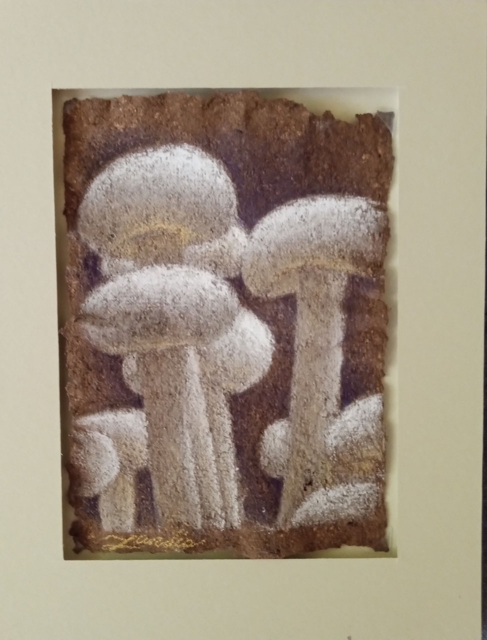 These one of a kind chalk pastel paintings are on 100% hand made mushroom paper. This paper is made by the artist and farmer using our farm grown mushrooms. Each piece is matted using acid free materials and will fit into a standard frame.